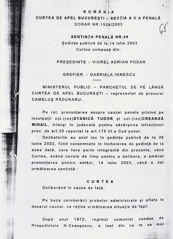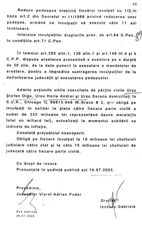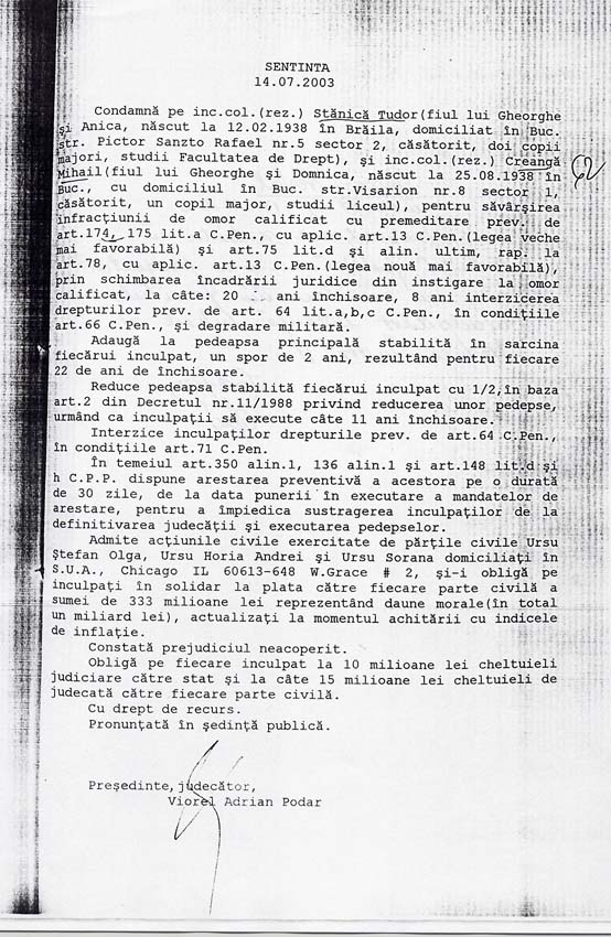 Sentinta din 14 iulie 2003, judecator Viorel Podar